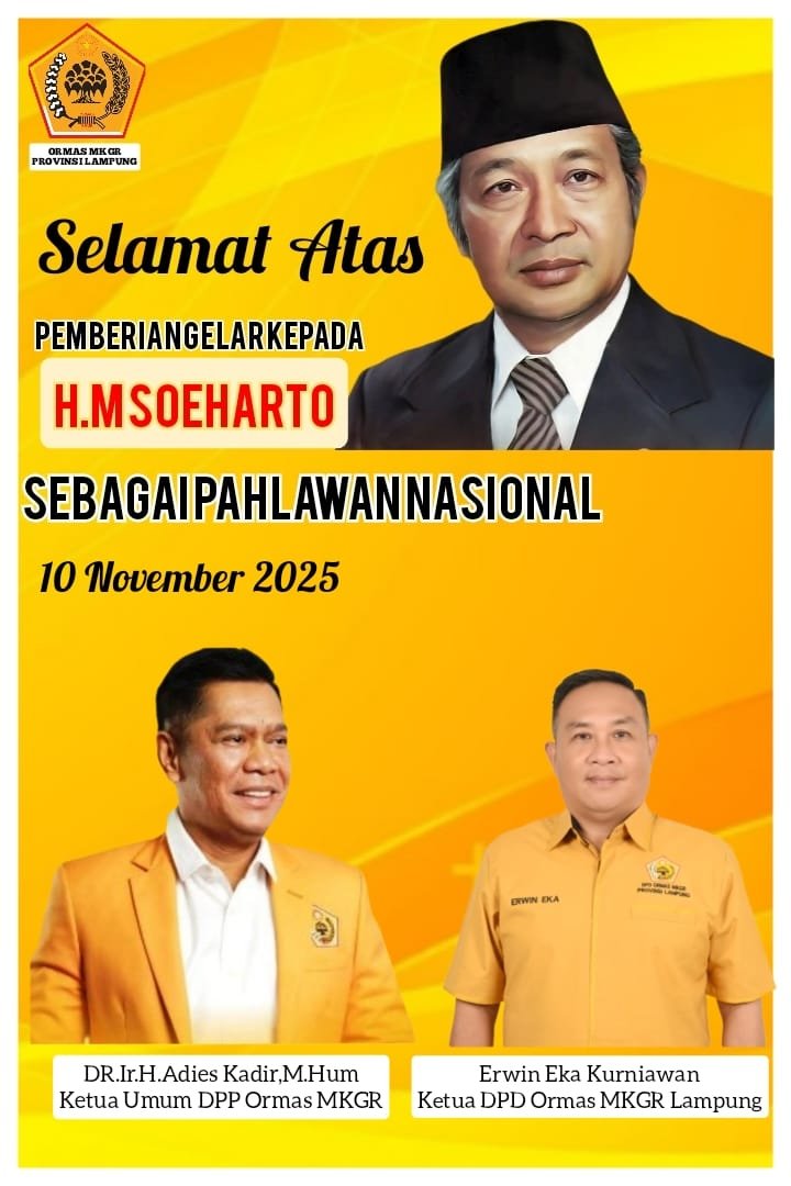Globalpewartasakti.com | Lampung (GPS) – Ketua ORMAS MKGR Provinsi Lampung, Erwin Eka Kurniawan, mengapresiasi pemberian gelar Pahlawan Nasional kepada Presiden ke-2 RI, Soeharto, yang diberikan oleh Presiden Prabowo Subianto pada Senin, 10 November 2025. Gelar ini diberikan berdasarkan Keputusan Presiden (Keppres) Nomor 116/TK Tahun 2025 tentang Penganugerahan Gelar Pahlawan Nasional.