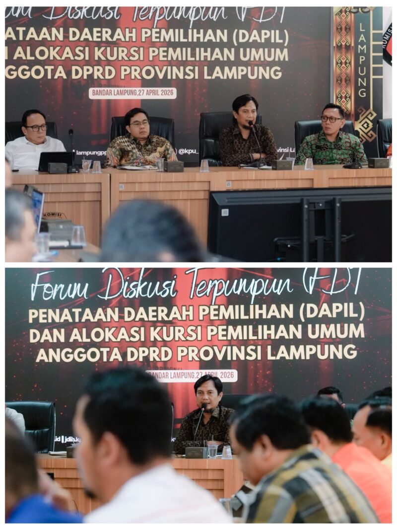 Globalpewartasakti.com | Lampung (GPS) – Komisi Pemilihan Umum Provinsi Lampung menggelar Forum Diskusi Terpumpun (FGT) terkait simulasi penataan daerah pemilihan (dapil) dan alokasi kursi untuk Pemilihan Umum anggota DPRD Provinsi Lampung. Kegiatan ini berlangsung di Kantor KPU Provinsi Lampung pada Senin, (27/04/2026).