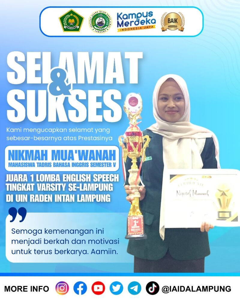 Nikmah Mua’wanah, mahasiswa Program Studi Tadris Bahasa Inggris Institut Agama Islam Darul A’mal (IAIDA) Lampung, berhasil meraih Juara 1 dalam ajang English Speech Competition tingkat Varsity se-Lampung. Kompetisi tersebut berlangsung di Universitas Islam Negeri (UIN) Raden Intan Lampung pada Sabtu (18/10/2025).