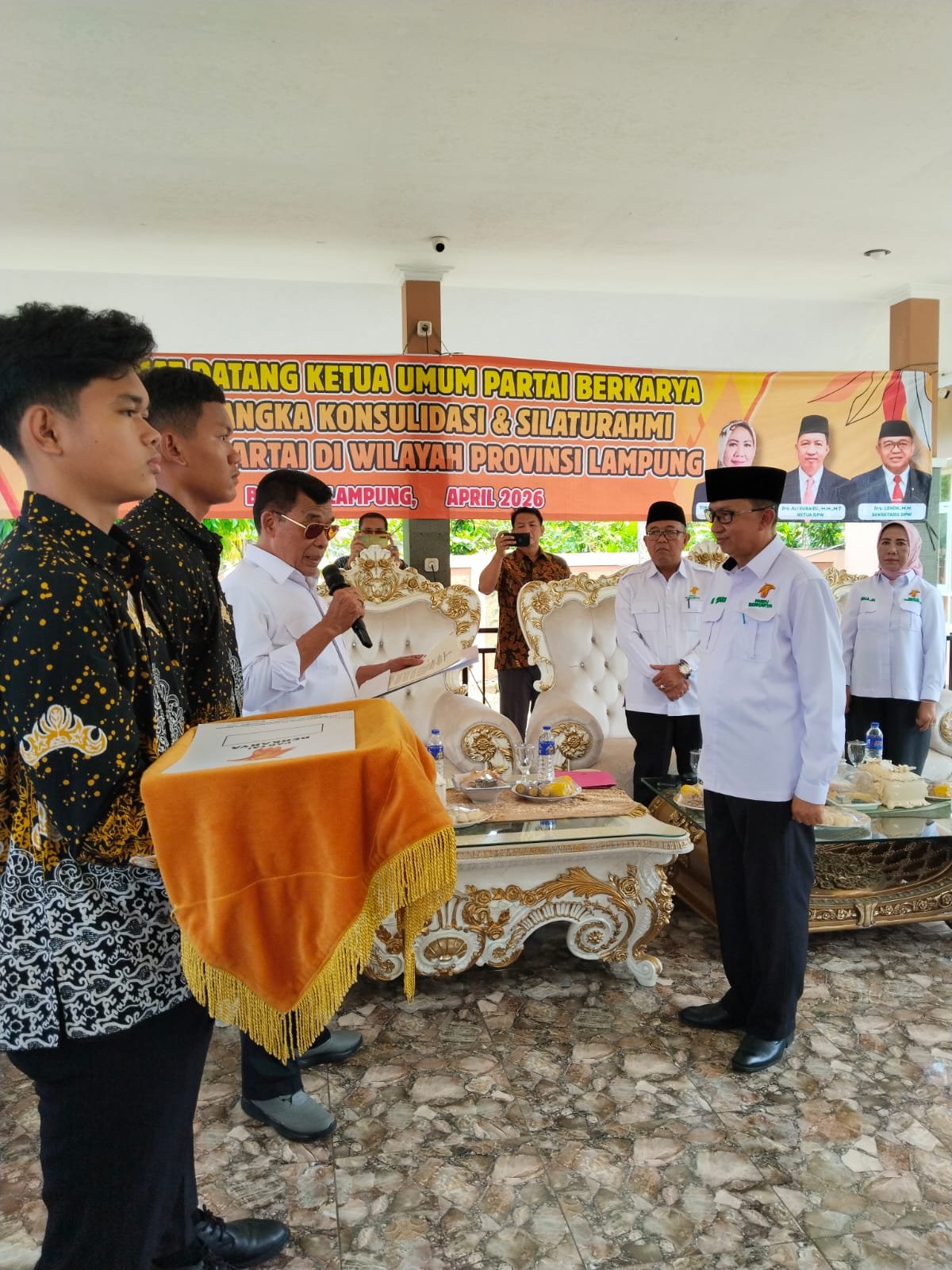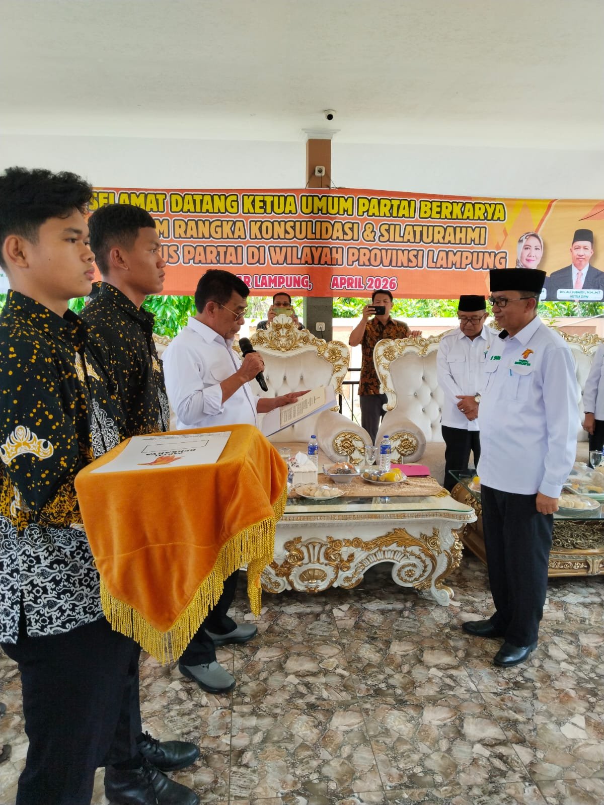 Ketua Umum Partai Berkarya Republik Indonesia, Mayjen TNI (Purn) Muhdi Pran Djono, didampingi Sekretaris Jenderal beserta rombongan, menghadiri kegiatan konsolidasi dan silaturahmi dengan jajaran pengurus DPW Partai Berkarya Provinsi Lampung yang berlangsung di Jl. Saburai No. 23, Rajabasa Jaya, Kecamatan Rajabasa, Kota Bandar Lampung, Selasa (7/4/2026).