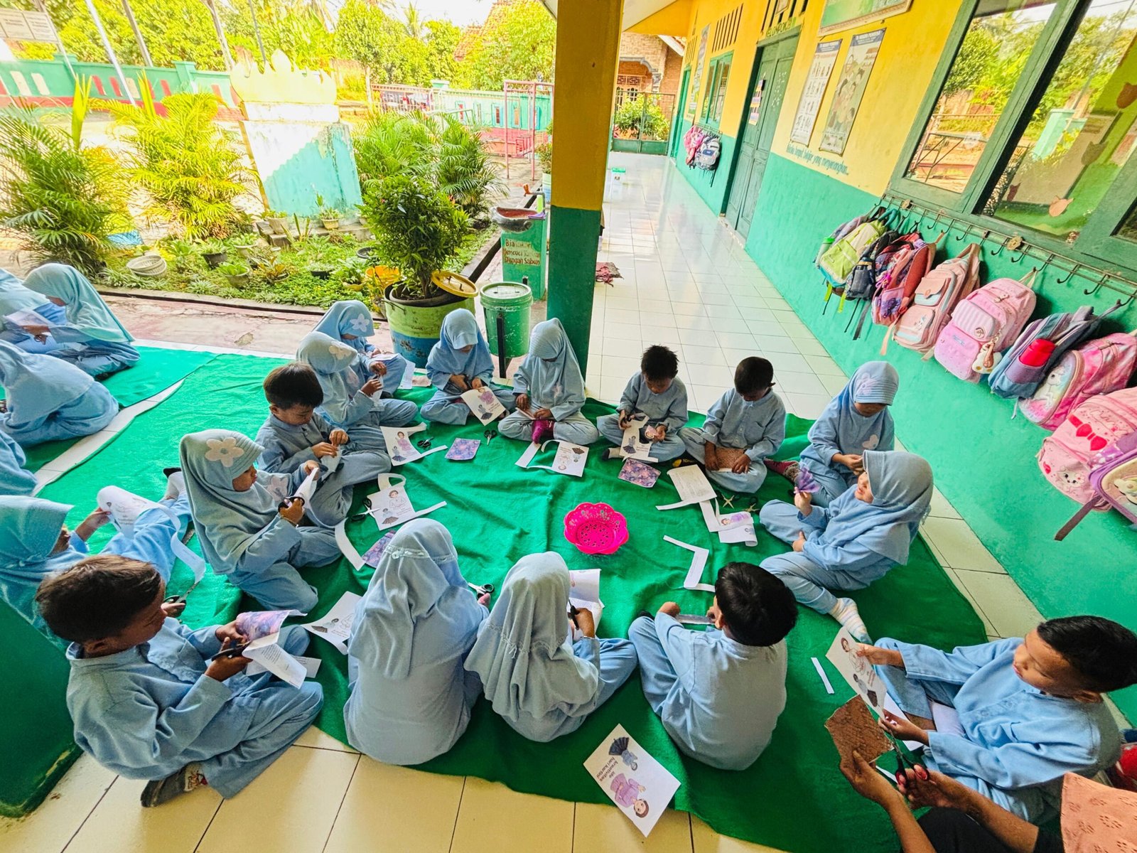 Anak-anak tampak aktif dan bersemangat saat mendengarkan kisah perjuangan Kartini yang disampaikan oleh para guru di lingkungan sekolah.