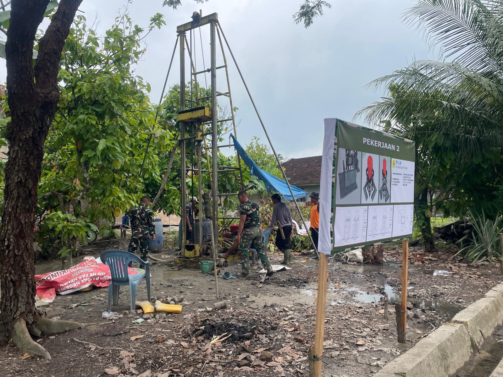 Di Desa Gunung Sari, personel TMMD memulai tahapan setting alat pengeboran di salah satu titik sumur bor milik warga. Proses ini meliputi penataan mesin bor, pemasangan rangka penyangga, serta pengecekan kesiapan peralatan sebelum pengeboran dilakukan. Tahap awal tersebut menjadi langkah penting untuk memastikan proses pengeboran berjalan aman, efektif, dan sesuai standar teknis di lapangan.